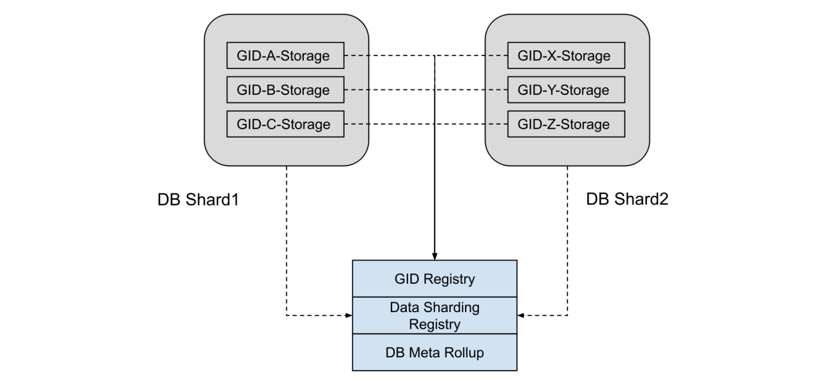 In order to horizontally expand the storage and computing capabilities of the entire Glacier Network, we do sharding for the Glacier Network, which consists of a large number of DB Shards. Each GID Storage belongs to one of the available DB Shards. Glacier has a global DB Sharding Registry that records the DB Shard to which each GID Storage belongs, along with the ID and address of each DB Shard.