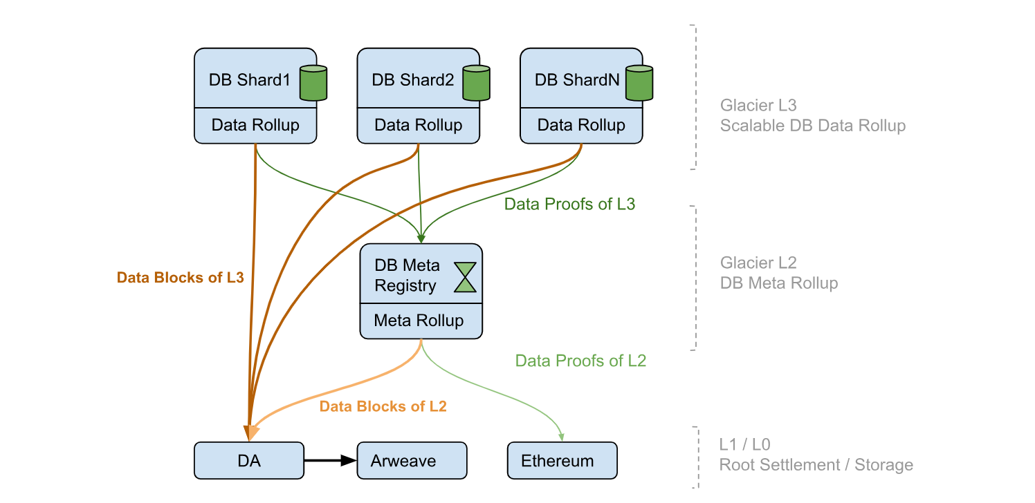 To ensure scalability and avoid limitations on the number of DB shards in the Glacier Network, a DB Meta Rollup has been introduced to provide settlement services for data rollups. The DB Meta Rollup serves as a Layer 2 solution for the Glacier Network, while the numerous data shards are built on top of it as a Layer 3 data network. This layered rollup structure enables almost unlimited expansion of the number of data shards.